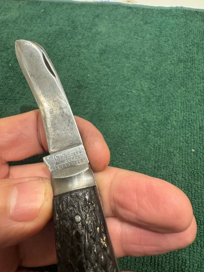 The blade face is very faintly stamped “SAYNOR”. The mark side tang is stamped “SAYNOR COOKE & RIDAL” and the pile side tang is stamped “OBTAIN”. It is assumed that the timeframe is early 1870s to early 20th century. The length closed is 4 ¼ inches. Scales are stag horn, with round butt end. Integral liners and bolsters. The blade is assumed to originally have been a hawkbill style.