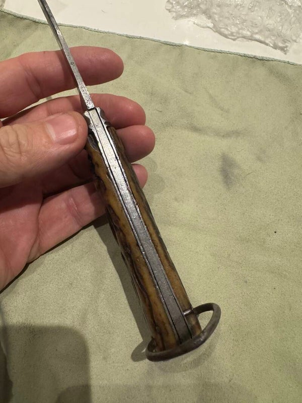 The blade face is very faintly stamped “SAYNOR”. The mark side tang is stamped “SAYNOR COOKE & RIDAL” and the pile side tang is stamped “OBTAIN”. It is assumed that the timeframe is early 1870s to early 20th century. The length closed is 4 ¼ inches. Scales are stag horn, with round butt end. Integral liners and bolsters. The blade is assumed to originally have been a hawkbill style.