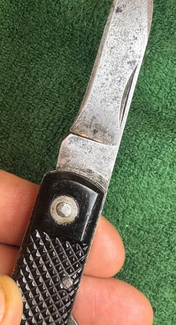 Clipped back blade, subsidiary tyre slasher hooked blade, chequered Bakelite two-piece grips with integral black bolster. See pages 46 and 47 British and Commonwealth Military Knives by Ron Flook. Use by S.O.E operators on under cover missions in France and other parts of Europe blade were without maker marks and many were dropped into France for the French resistance