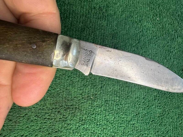 Maker: George Wolstenholm & Son. The mark side tang is stamped I*XL GEORGE WOSRENHOLM & SON" over four lines. It has a closed length of 4 ¼ inches, hard wood scales, non-integral steel liners and nickel silver bolsters. The butt end is factory-drilled for a lanyard.