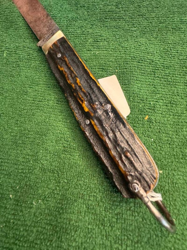 It has a closed length of 4 5/8 inches, stag horn scales, non-integral steel liners, nickel silver bolsters, and a steel shackle and pin.
