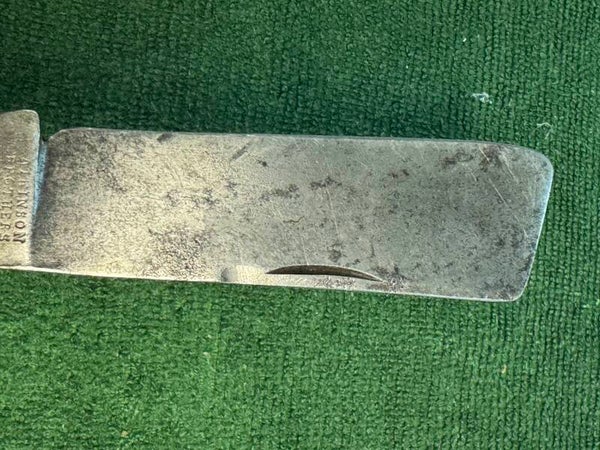 Maker: "ATKINSON BROTHERS SHEFFIELD" is stamped on the mark side tang, and the pile side tang is stamped "WiD 18" in an unusually small type size. The knife a closed length of 4 ¾ inches, stag horn scales, integral steel liners and bolsters, hand-forged tapered backspring, and copper shackle secured by a brass pin.