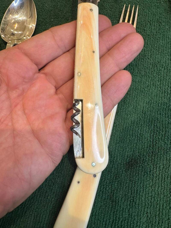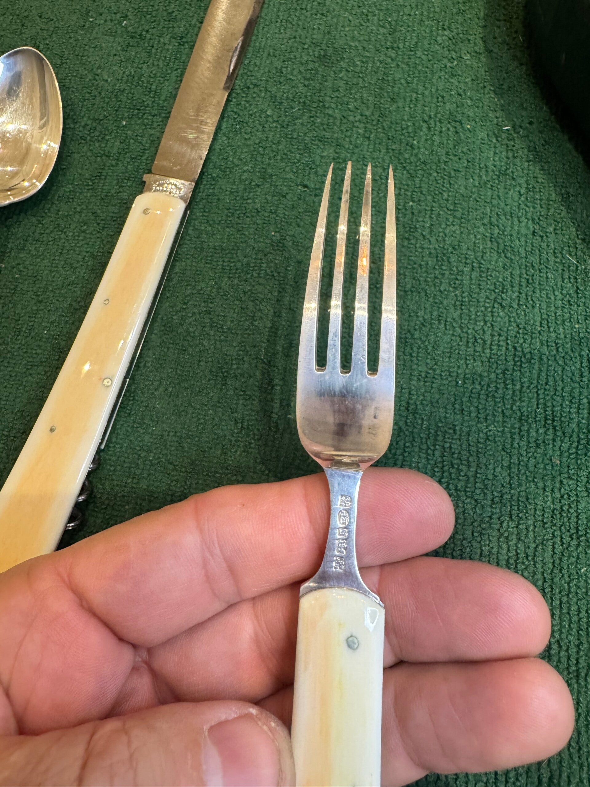 Full set silver spoon fork and knife top end campaign set in leather case lined in red fabric all in good working order lovely lvory scales
